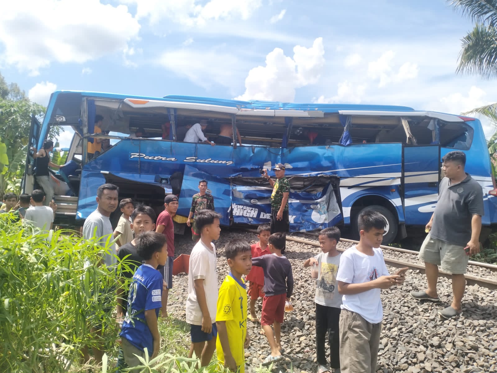 Kondisi Bus Putra Sulung bermuatan belasan penumpang ringsek, terdorong kereta puluhan meter. Para penumpang terjepit dan terlempar keluar Bus.