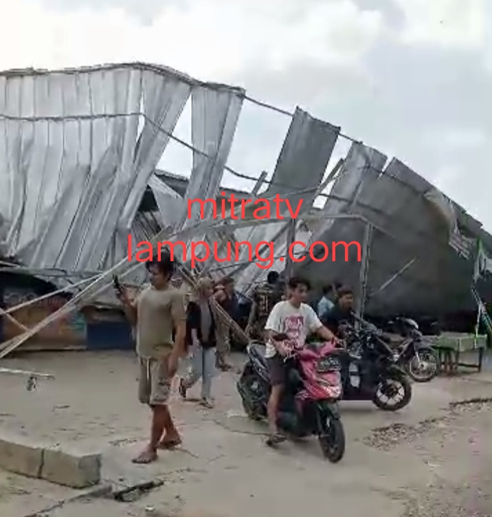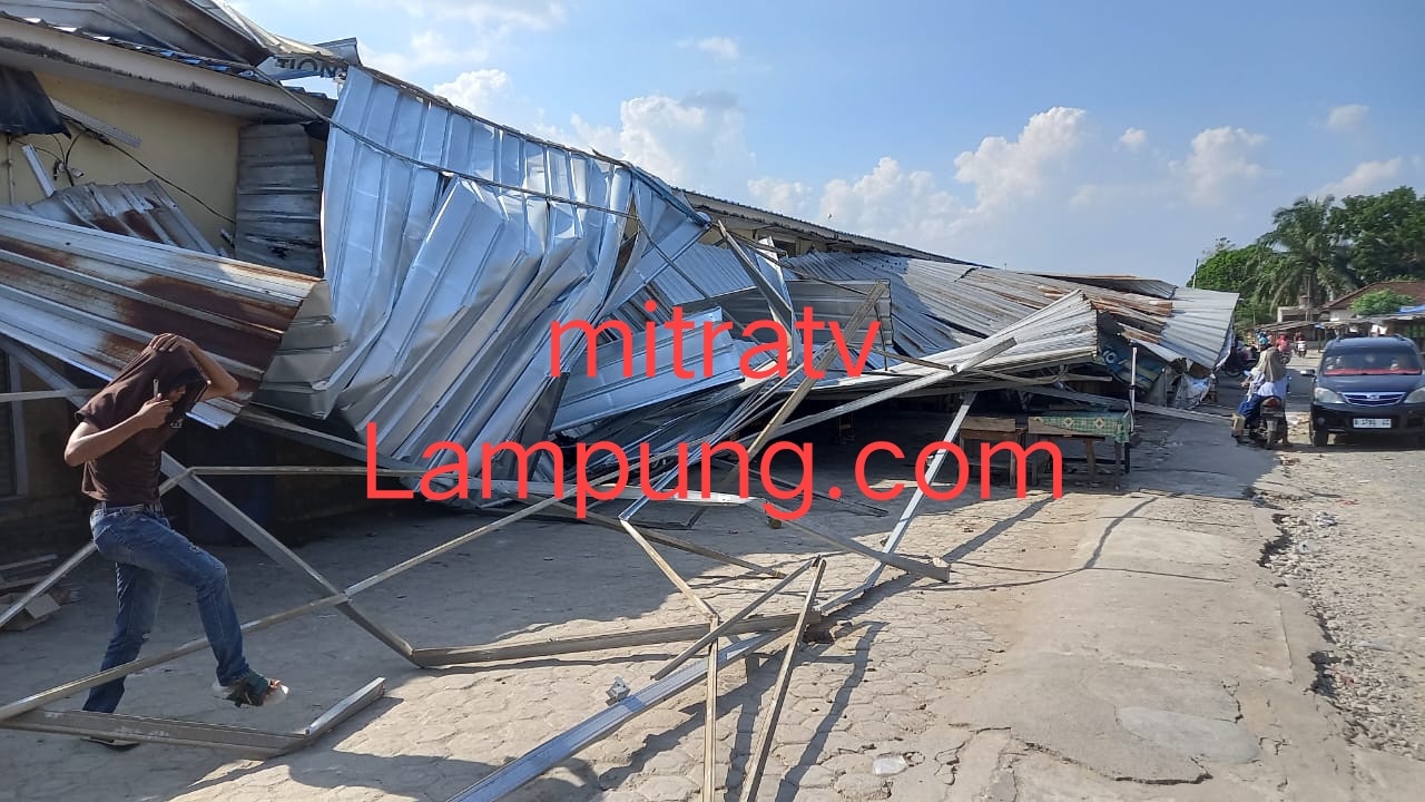 Sekitar 19 lokal atau pelataran kios pedagang di Pasar Gaya Baru, Kampung Gaya Baru 1, Kecamatan Seputih Surabaya, Kabupaten Lampung Tengah, porak-poranda diterjang angin puting beliung.