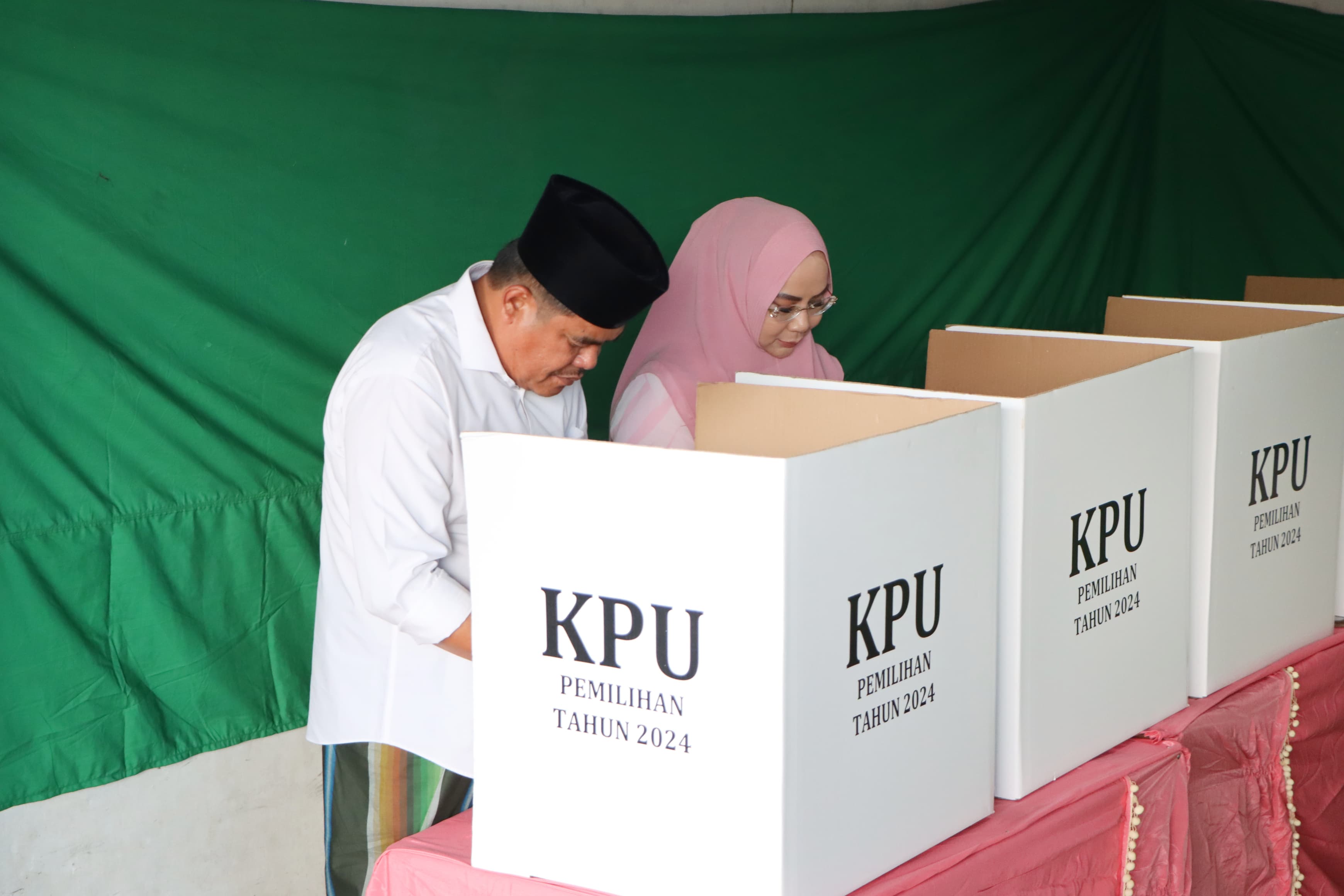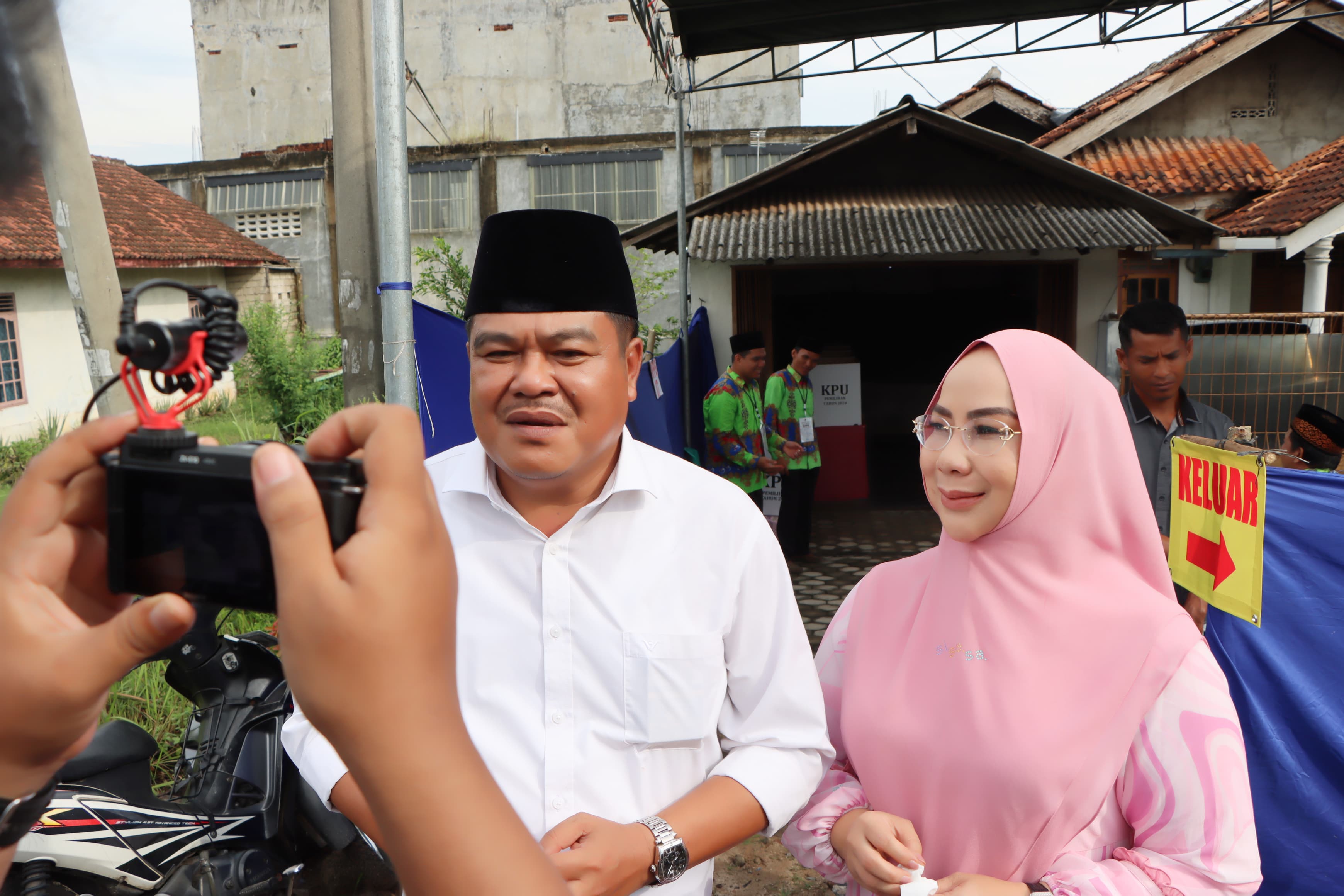 Bupati Lampung Tengah H.Musa Ahmad.,S.Sos.,MM, bersama Yuniar memberikan hak Suaranya di hari pencoblosan Pilkada 2024 Rabu (27/11/24) di TPS 20 Kelurahan Yukumjaya Kecamatan Terbanggi Besar pada pukul 08.00 WIB.