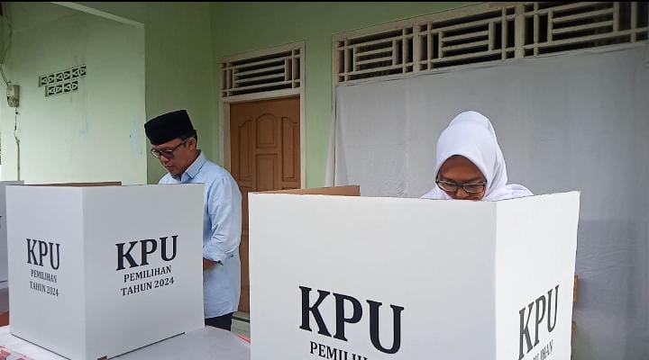 Wakil Bupati Lampung Tengah dr Ardito Wijaya didampingi sang istri Indria Sudrajat., S.Hut.,MM., memberikan hak suaranya dalam pemilihan kepala daerah di TPS 03 Kampung Karang Endah, Kecamatan Terbanggibesar, Rabu (27/11/2024).